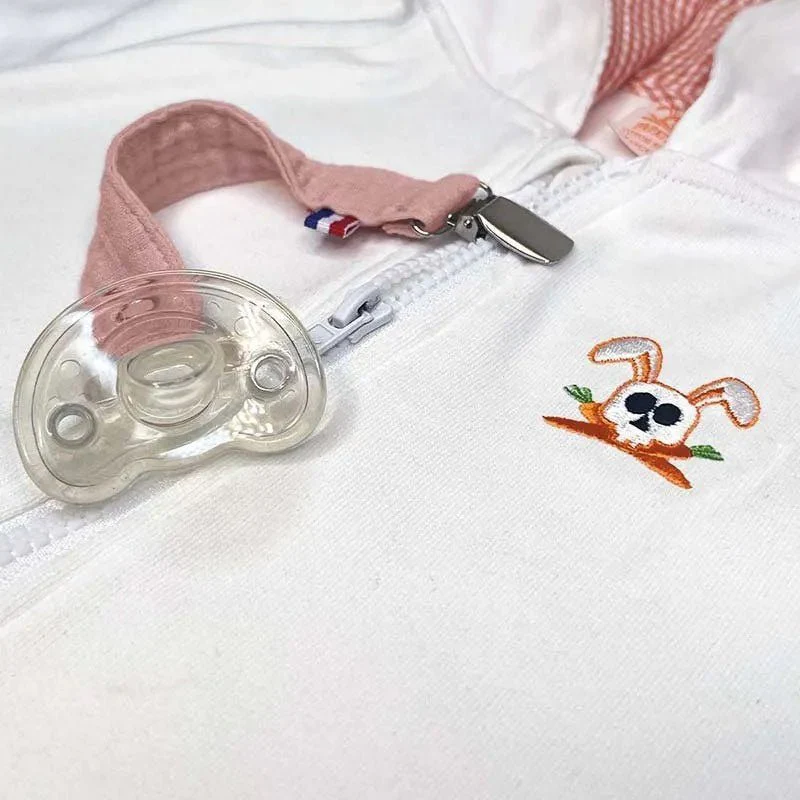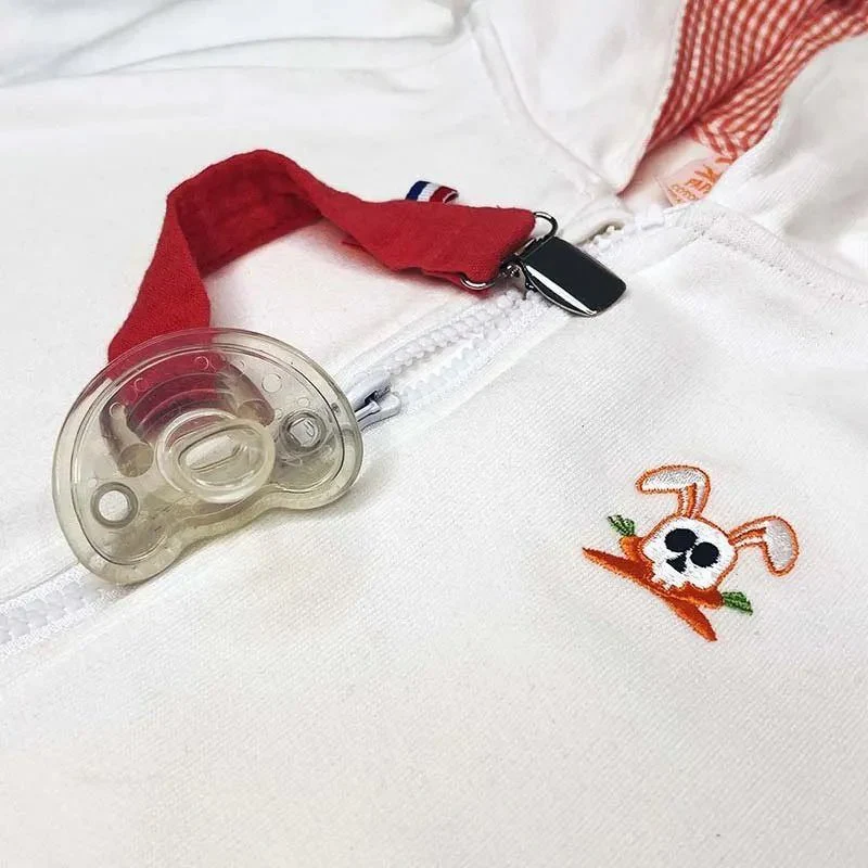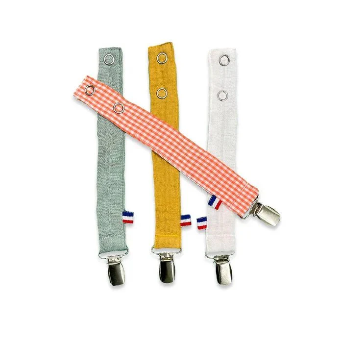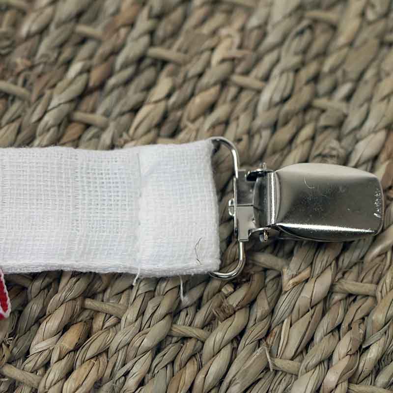 L’attache tétine est composée de trois parties. La première partie est un clip qui se fixe sur le vêtement de l’enfant. Nos clips sont garantis sans nickel. La deuxième est un lien en coton Bio imprimé Vichy orange certifié GOTS, qui permet de relier les deux extrémités. La troisième partie permet de maintenir la tétine à portée de main de l’enfant.