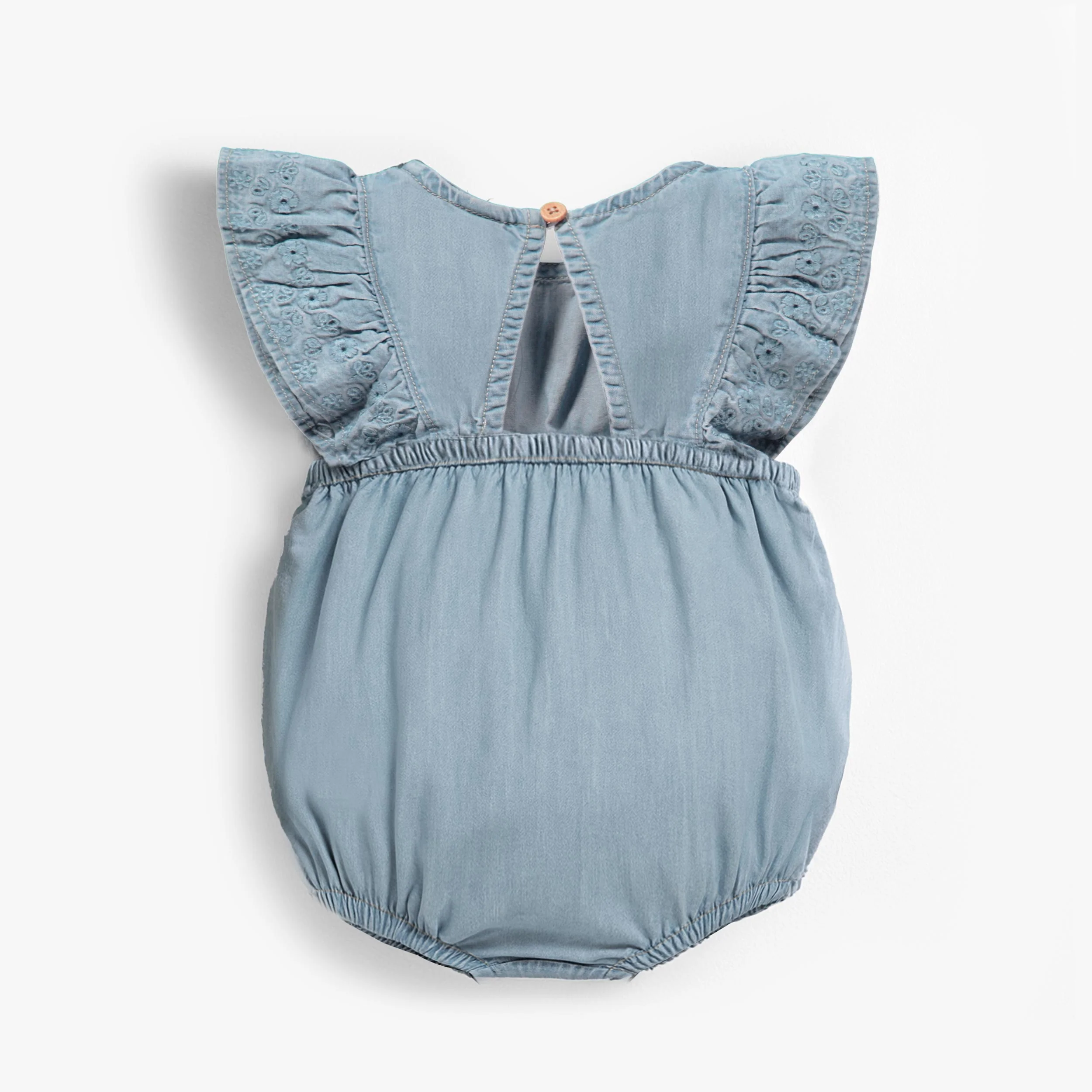 Barboteuse bleu pâle en denim avec broderie anglaise, naissance