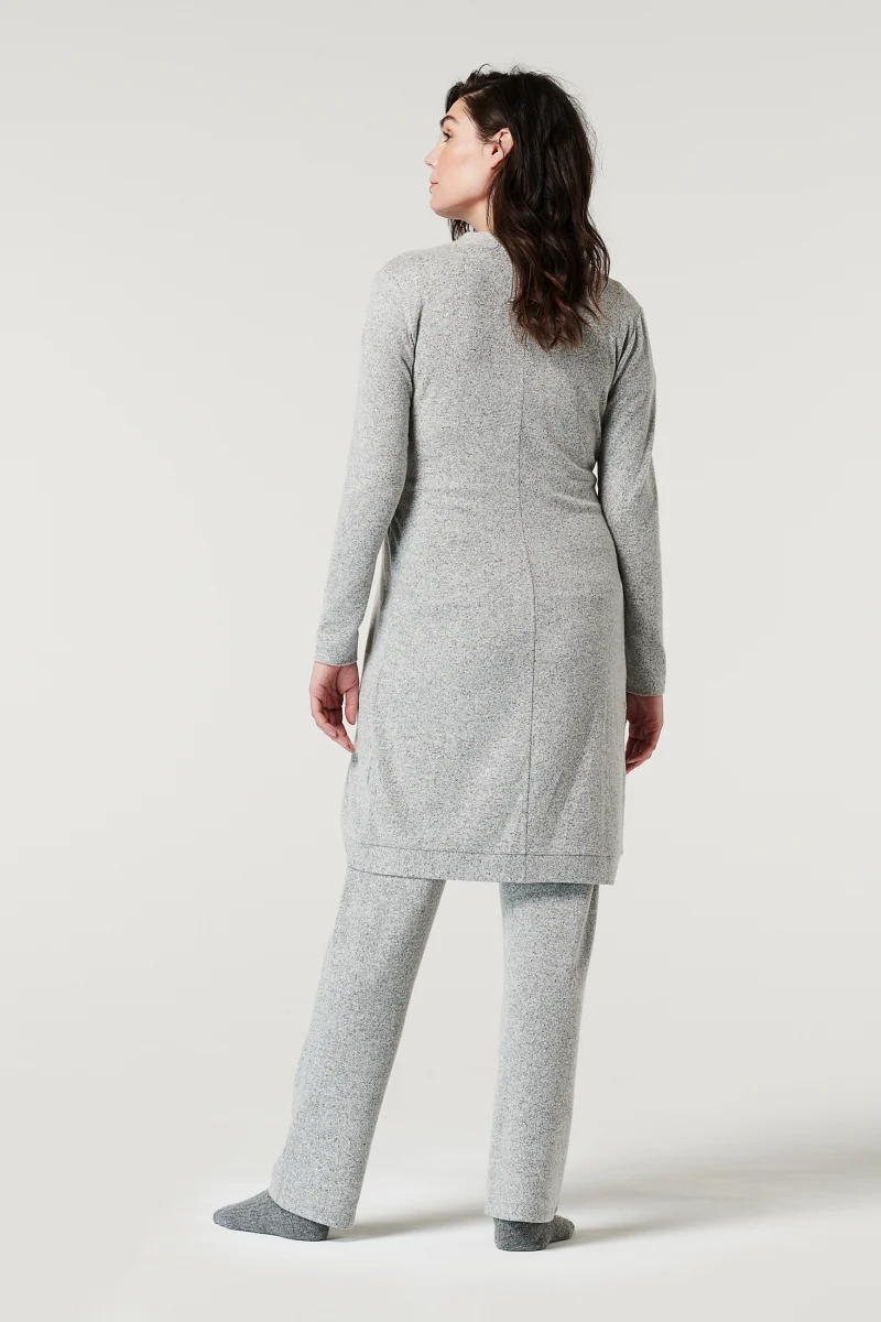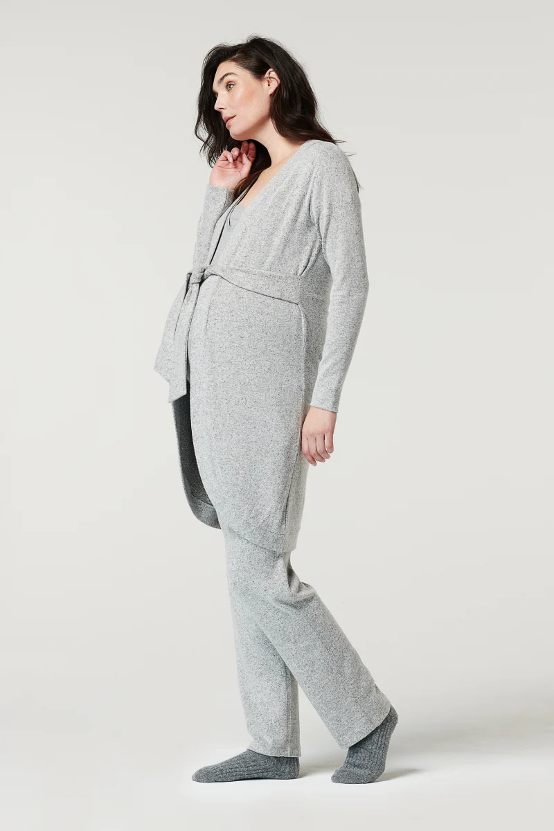 Un joli cardigan long pour vous garder au chaud, vous et votre bébé. Le cardigan est composé d’un tissu souple qui vous permet de bouger en toute liberté. Pour plus de confort et de chaleur, il suffit de nouer le cordon autour de votre ventre. Nous proposons également un pantalon assorti.