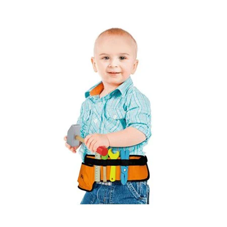 Ensemble de 10 pièces pour les jeunes menuisiers du monde entier. Le tissu robuste et la ceinture réglable comportent une poche pratique et des boucles élastiques pour contenir les outils et la quincaillerie en bois inclus : un marteau, une clé, une pince, un tournevis, une règle, 2 vis et 2 écrous.