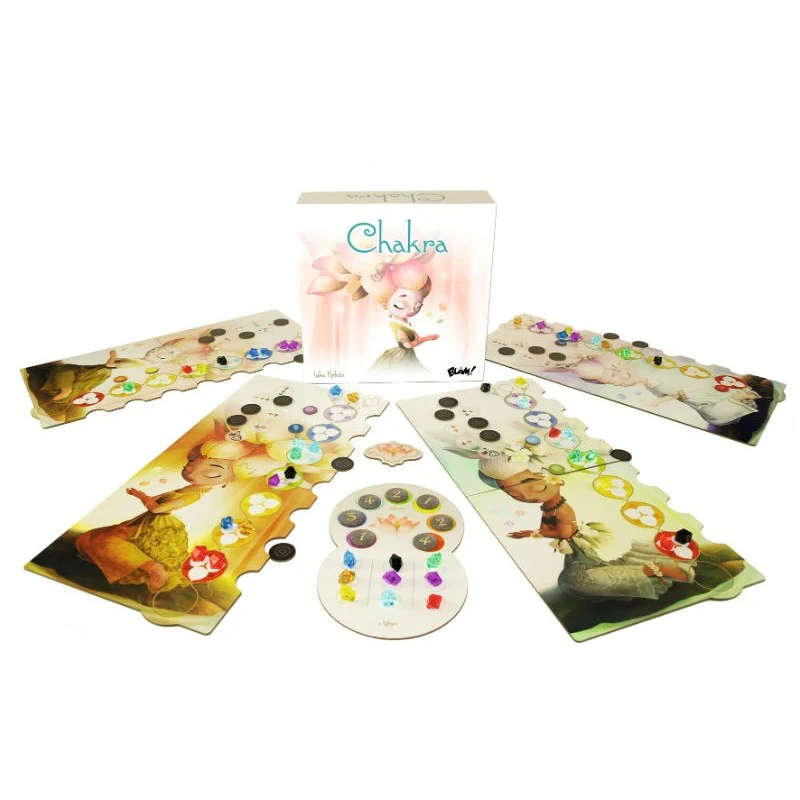 Chakra propose, dans une ambiance zen, de se triturer les méninges en quête de tranquillité intérieure. Récupérez des gemmes pour trouver l’harmonie, faites-les circuler dans votre corps afin d’aligner vos chakras et prenez gare à ne pas vous laisser perturber par les énergies négatives! Le joueur le plus serein remportera la partie !