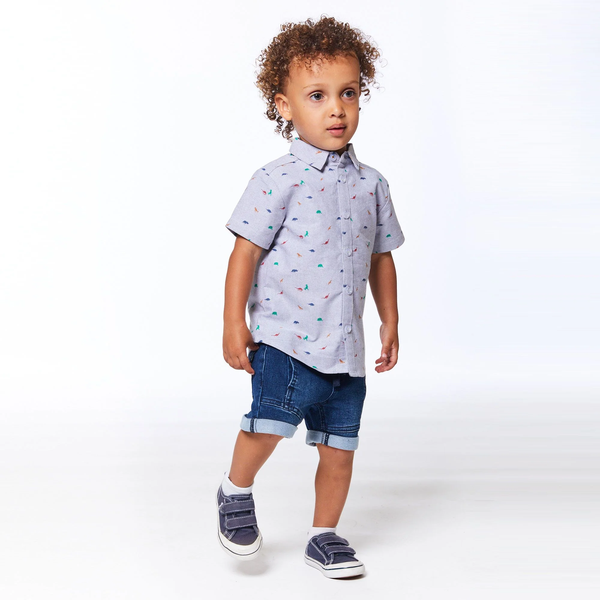 Avec sa silhouette boutonnée, notre chemise à manches courtes gris pâle chiné avec imprimé de mini dinosaures est parfaite pour être associée à un jean, un pantalon en sergé ou un short uni. Cette chemise est fabriquée en 100 % coton et comporte une plaquette à boutons, un collet et un imprimé de dinosaures colorés.