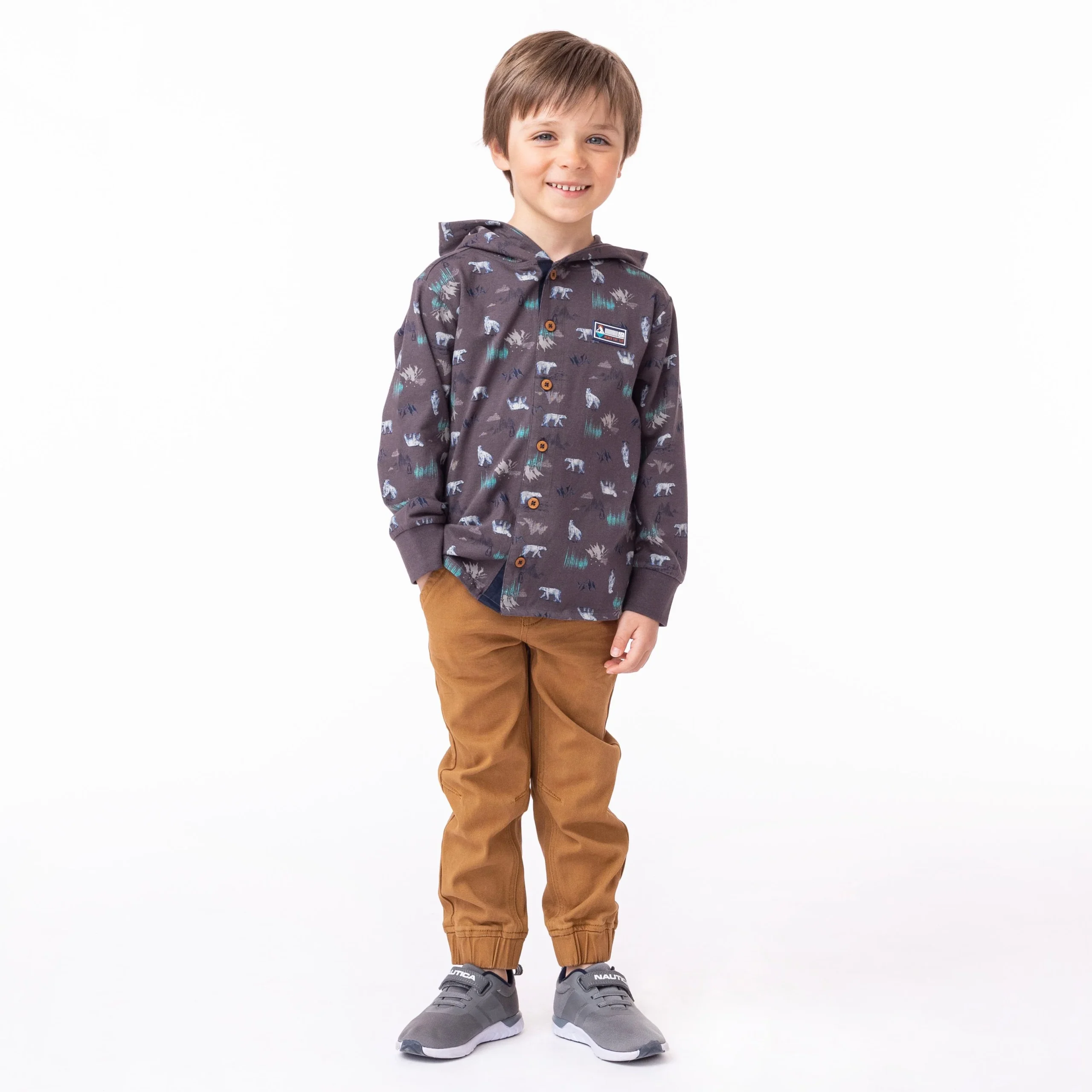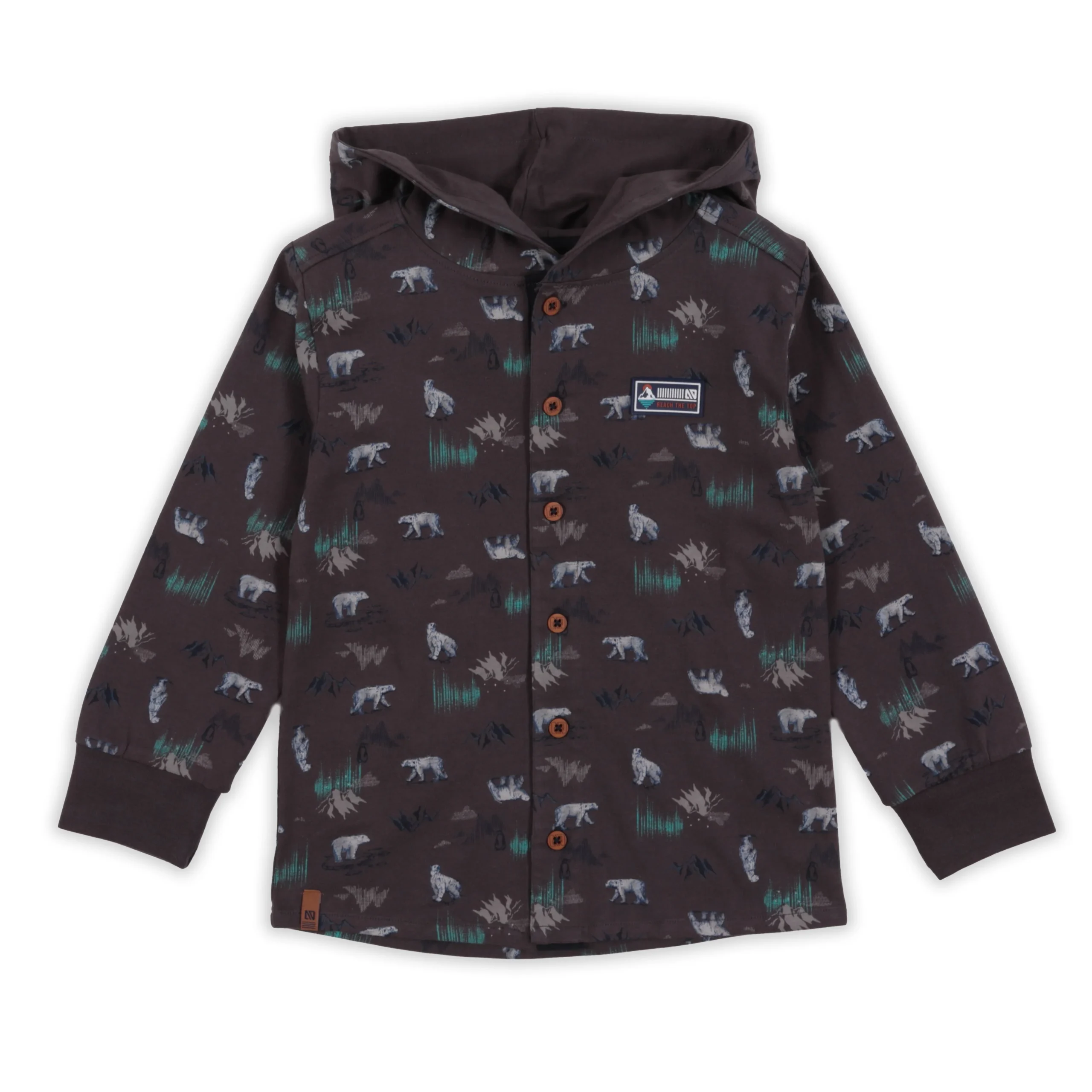• Chemise en jersey imprimé • Encolure à capuchon• Manches longues• Poignets côtelés• Fermeture à boutons au-devant S’agence avec un jeans ou encore le jogger charbon