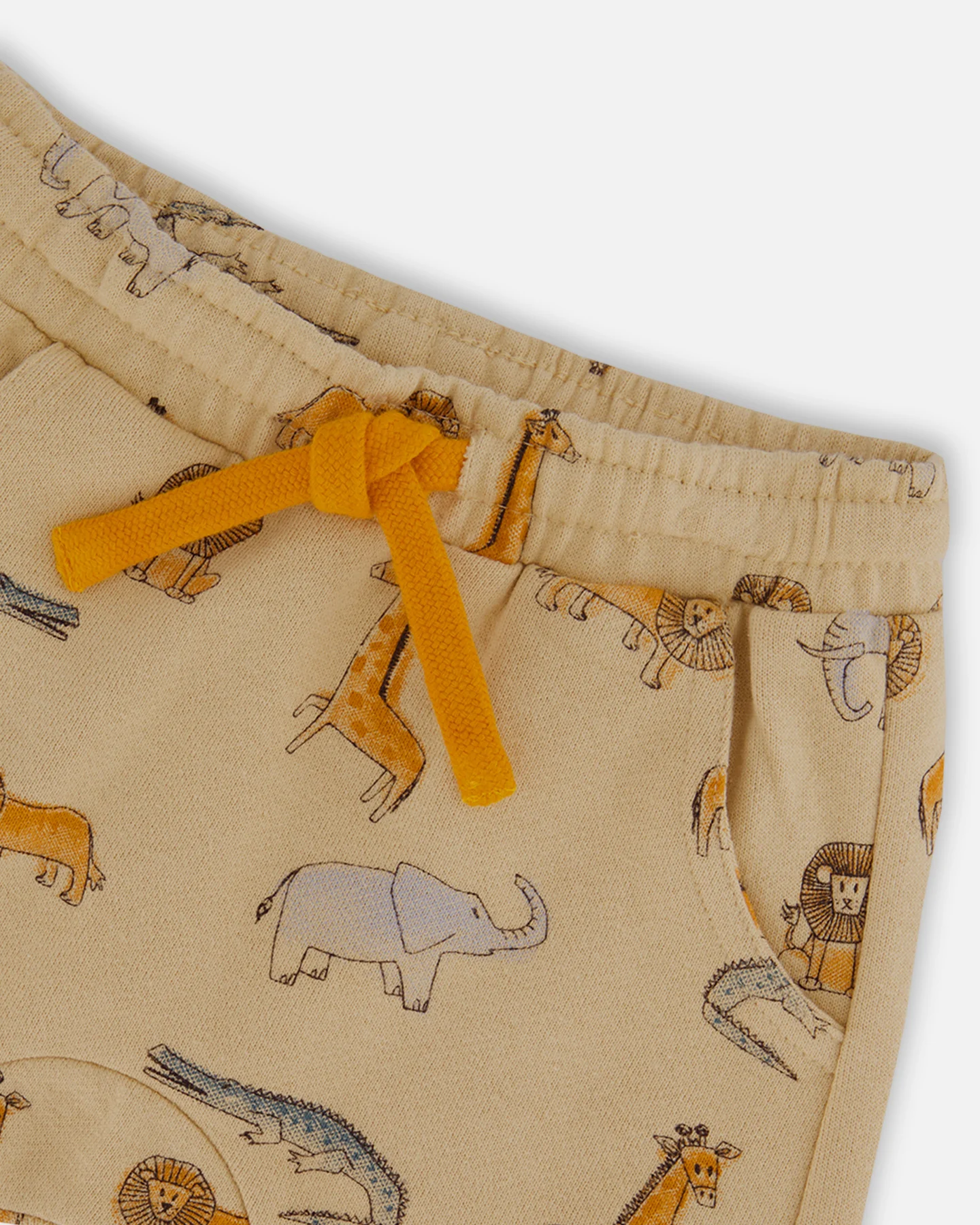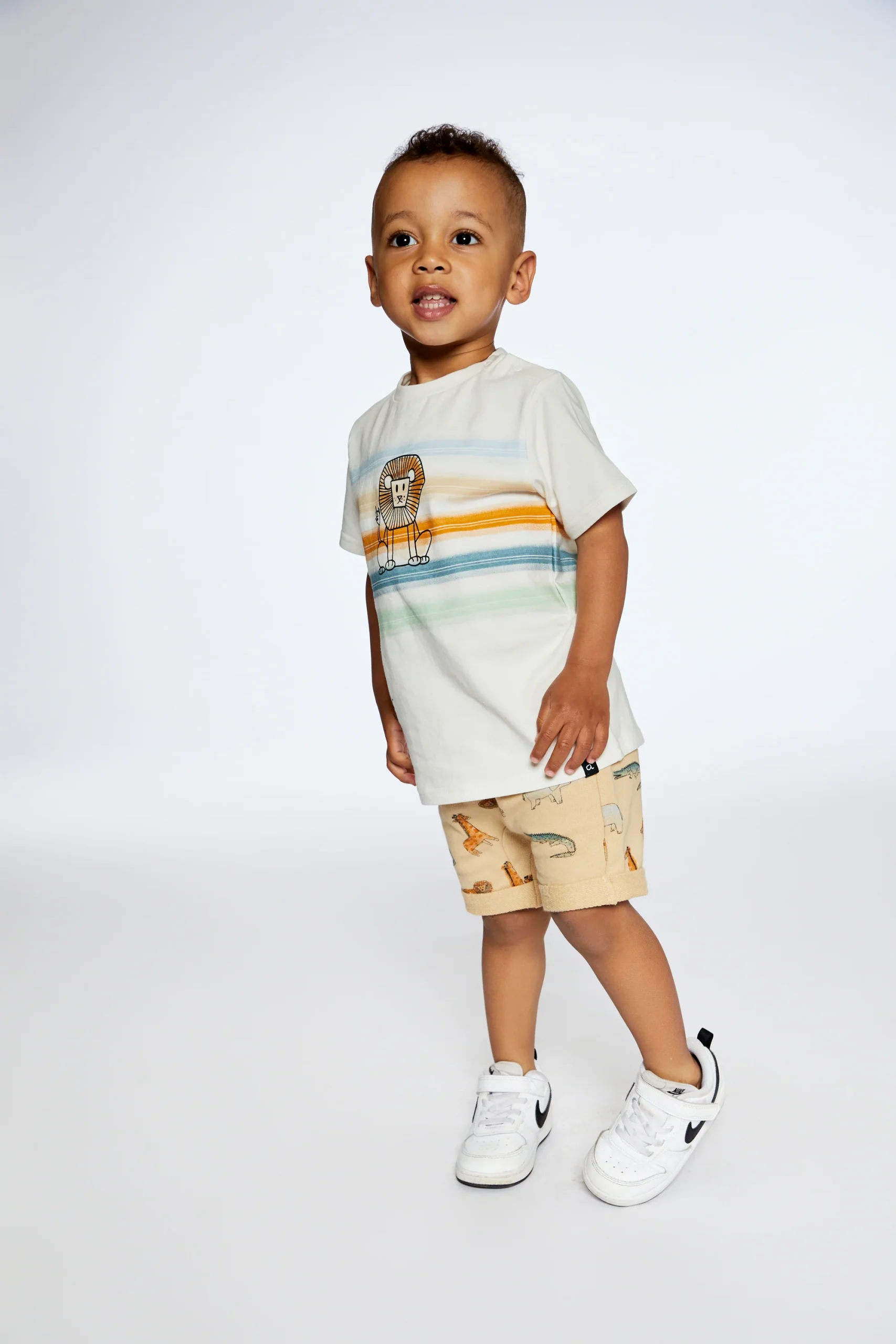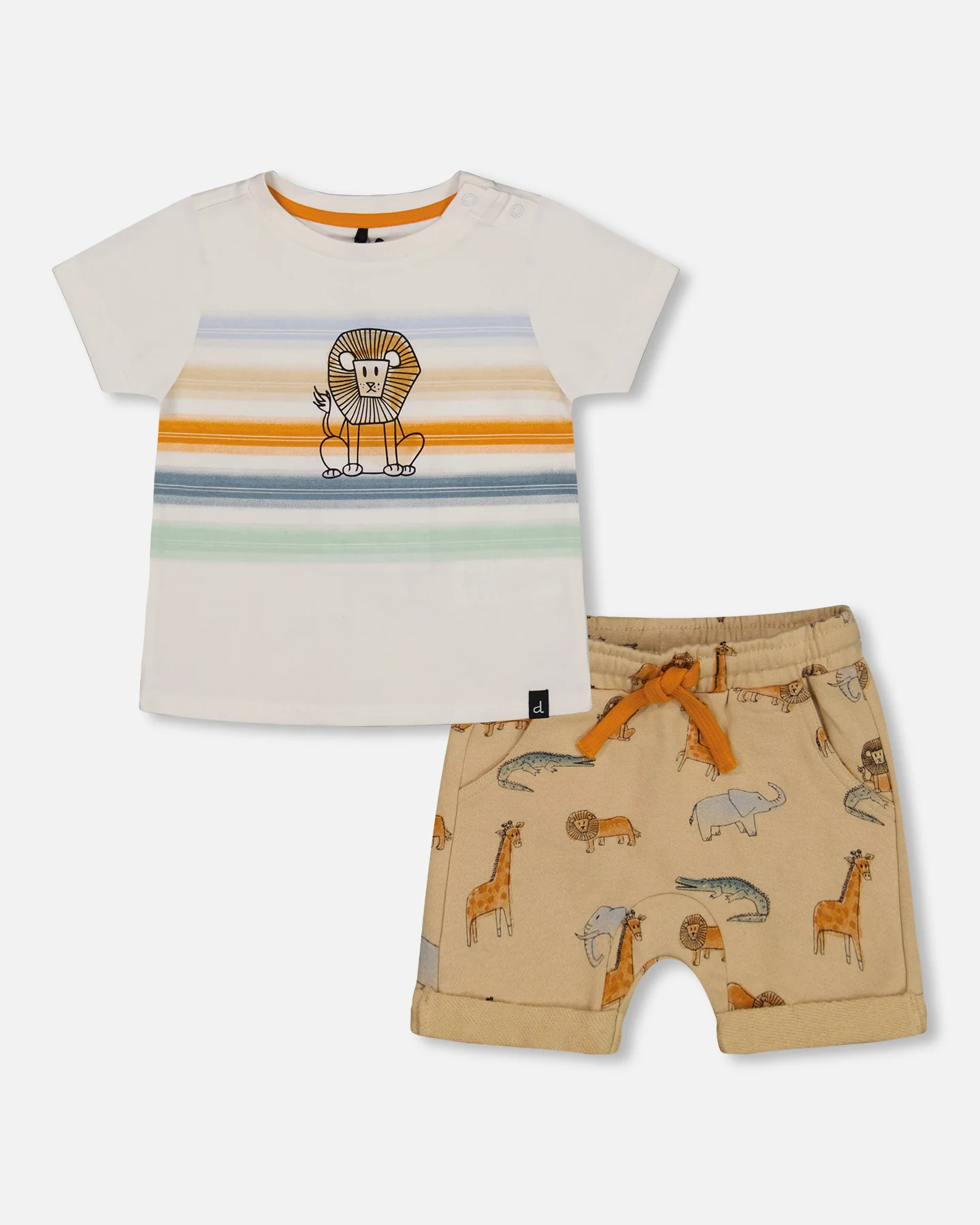 Des lions, des éléphants et des girafes ajoutent une touche sauvage à notre ensemble chemise et short en coton français beige avec imprimé d’animaux de la jungle. Cet ensemble super confortable comprend un t-shirt à manches courtes avec un col rond, des rayures horizontales et un graphique de lion sur la poitrine. Le short en coton français présente une coupe à enfiler extensible avec une taille élastique, des jambes resserrées et un imprimé d’animaux de la jungle sur toute la surface.