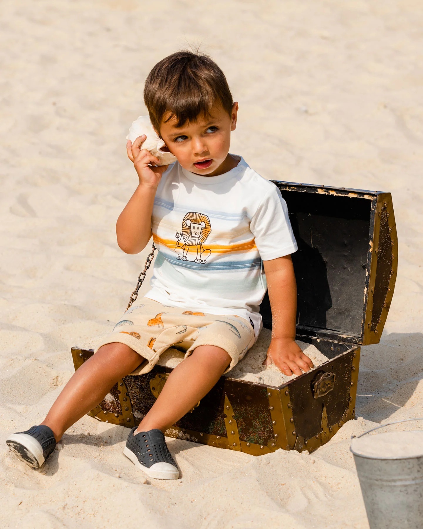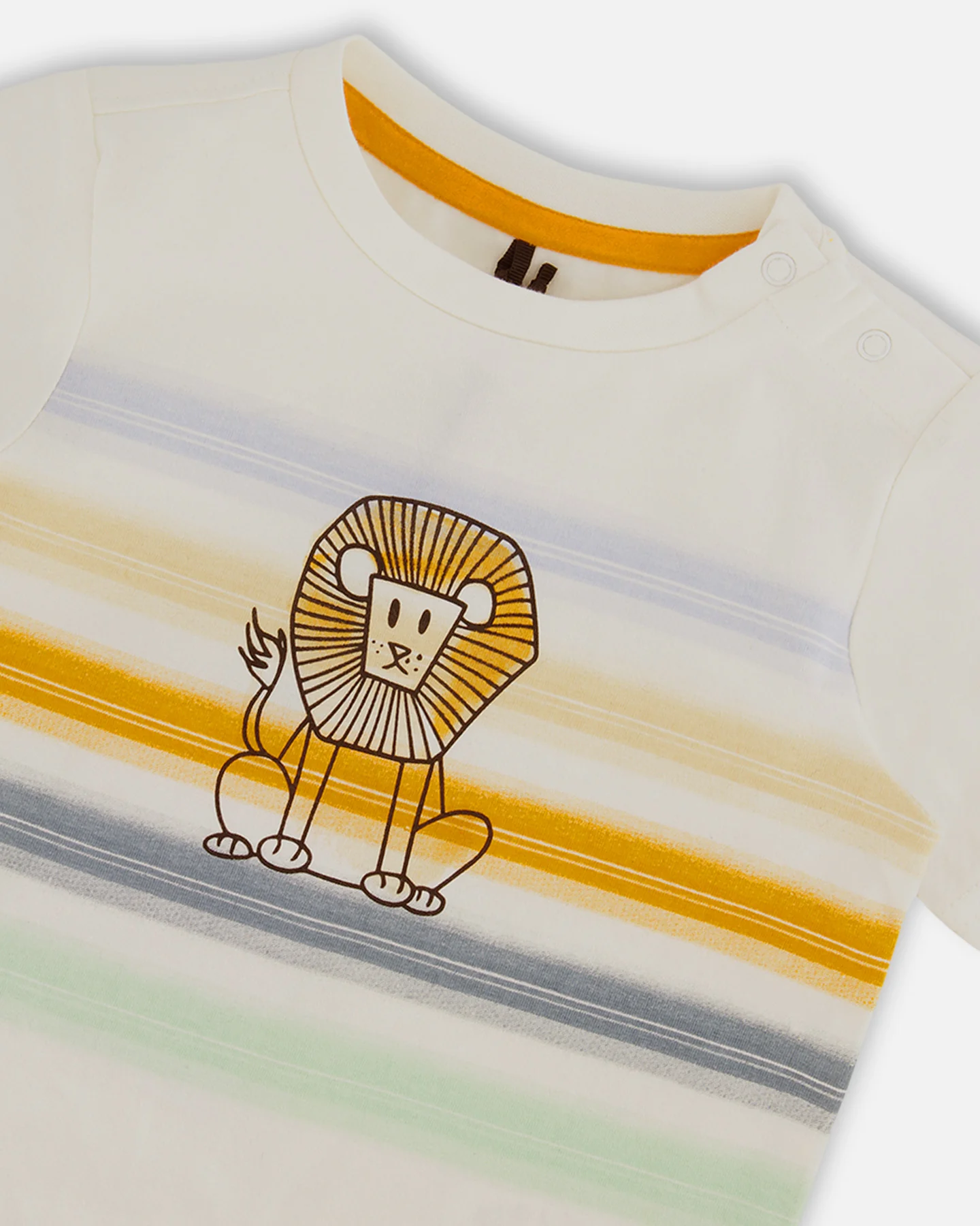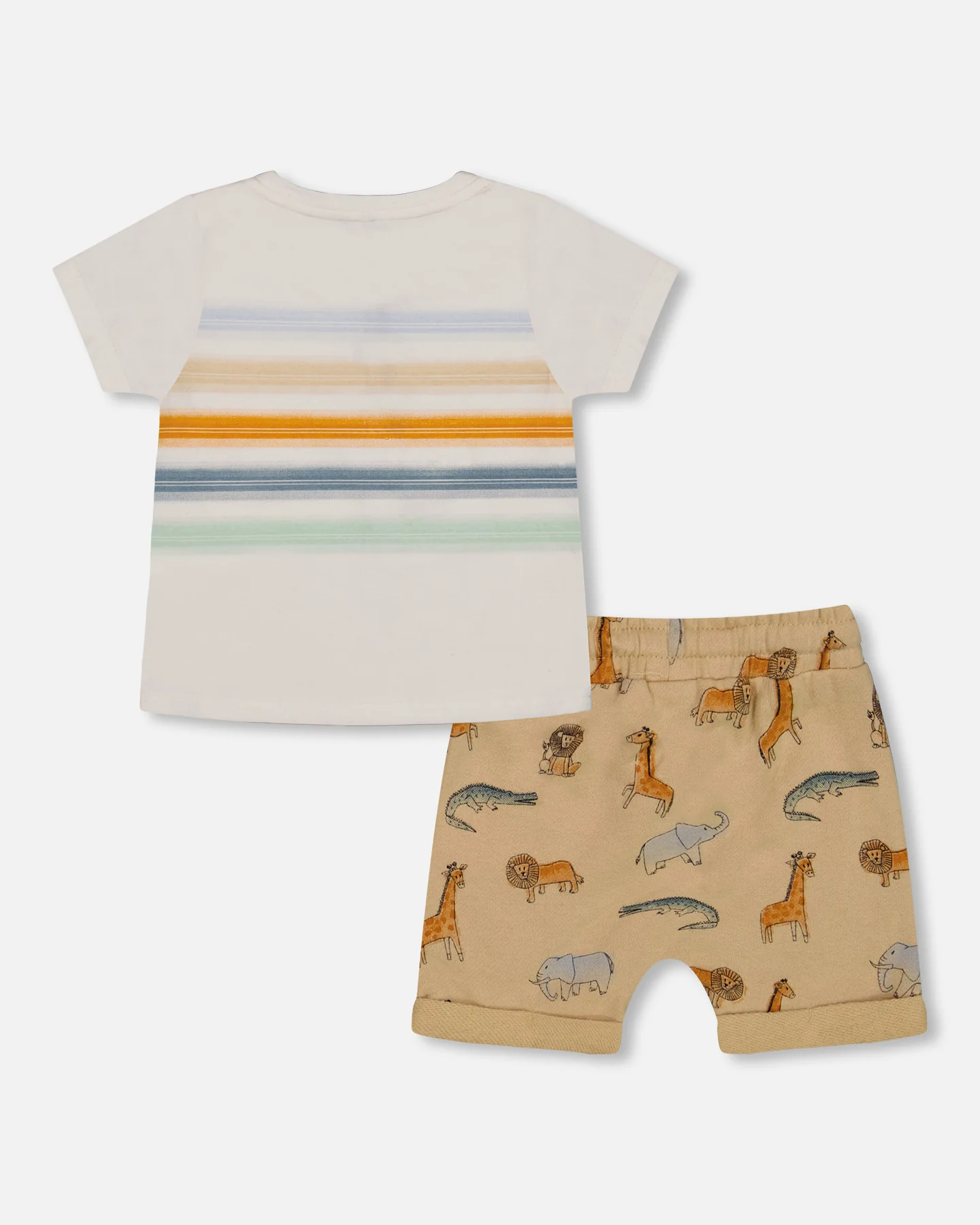 Des lions, des éléphants et des girafes ajoutent une touche sauvage à notre ensemble chemise et short en coton français beige avec imprimé d’animaux de la jungle. Cet ensemble super confortable comprend un t-shirt à manches courtes avec un col rond, des rayures horizontales et un graphique de lion sur la poitrine. Le short en coton français présente une coupe à enfiler extensible avec une taille élastique, des jambes resserrées et un imprimé d’animaux de la jungle sur toute la surface.