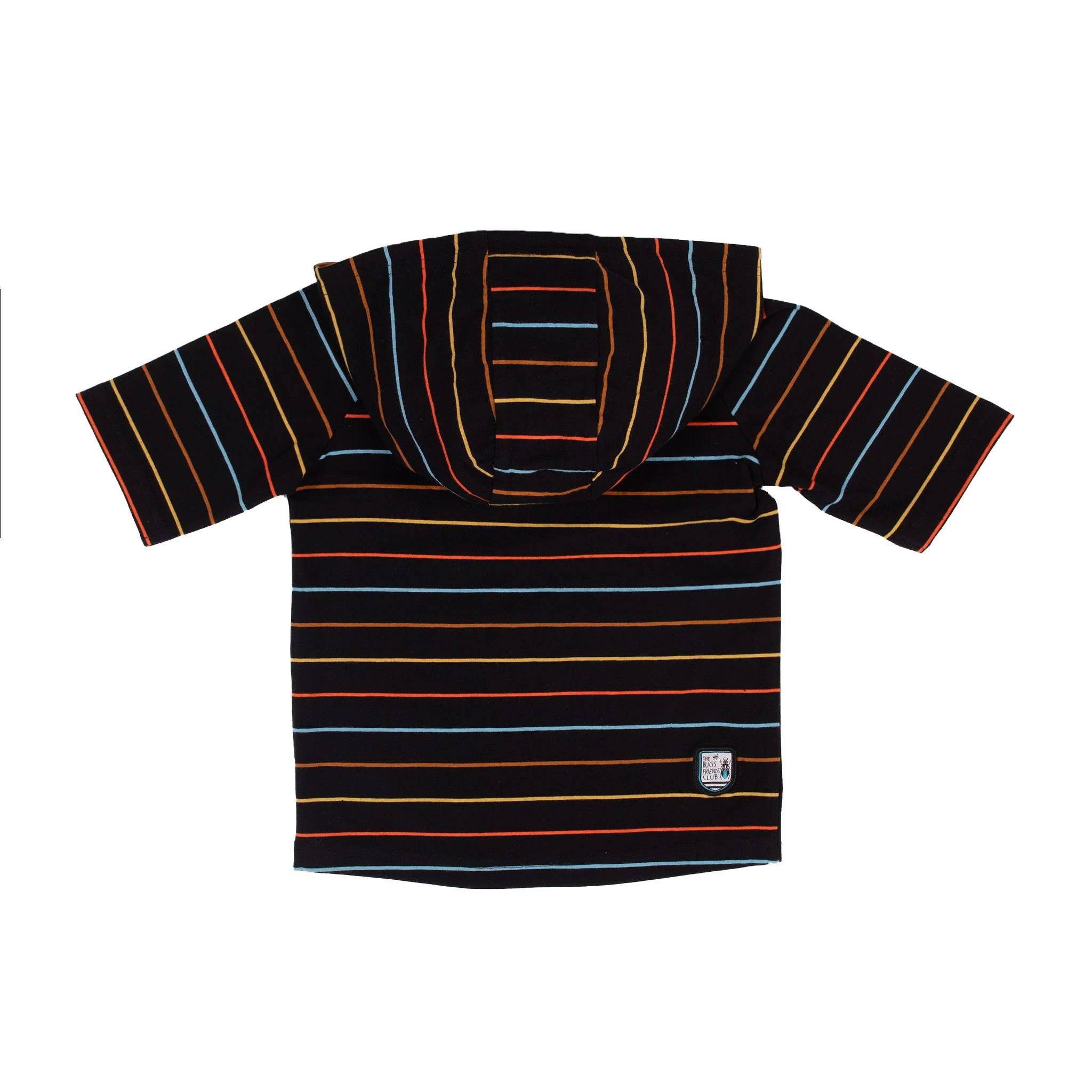 T-shirt en jersey uni à capuchon et manches 3/4 raglan à rayures. Modèle avec poche kangourou à rayures et imprimé au devant