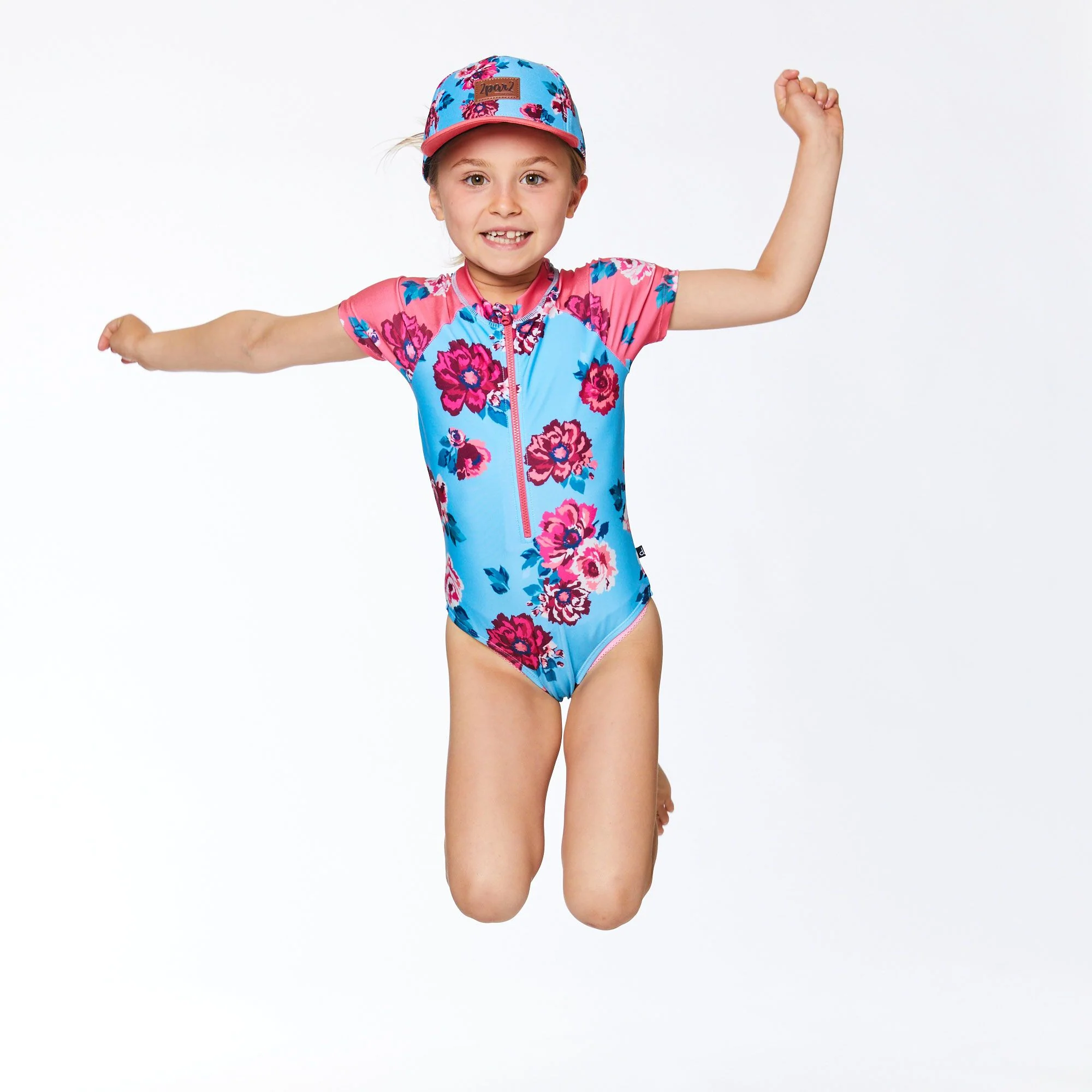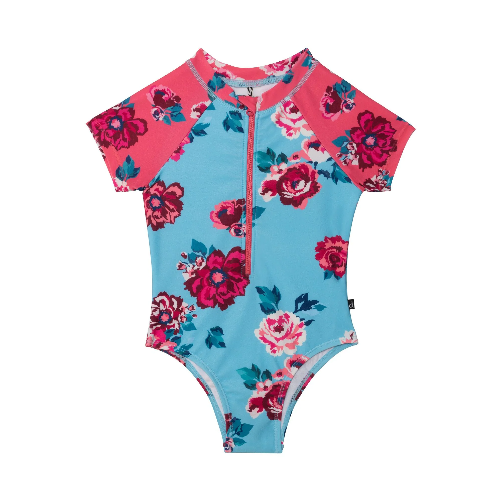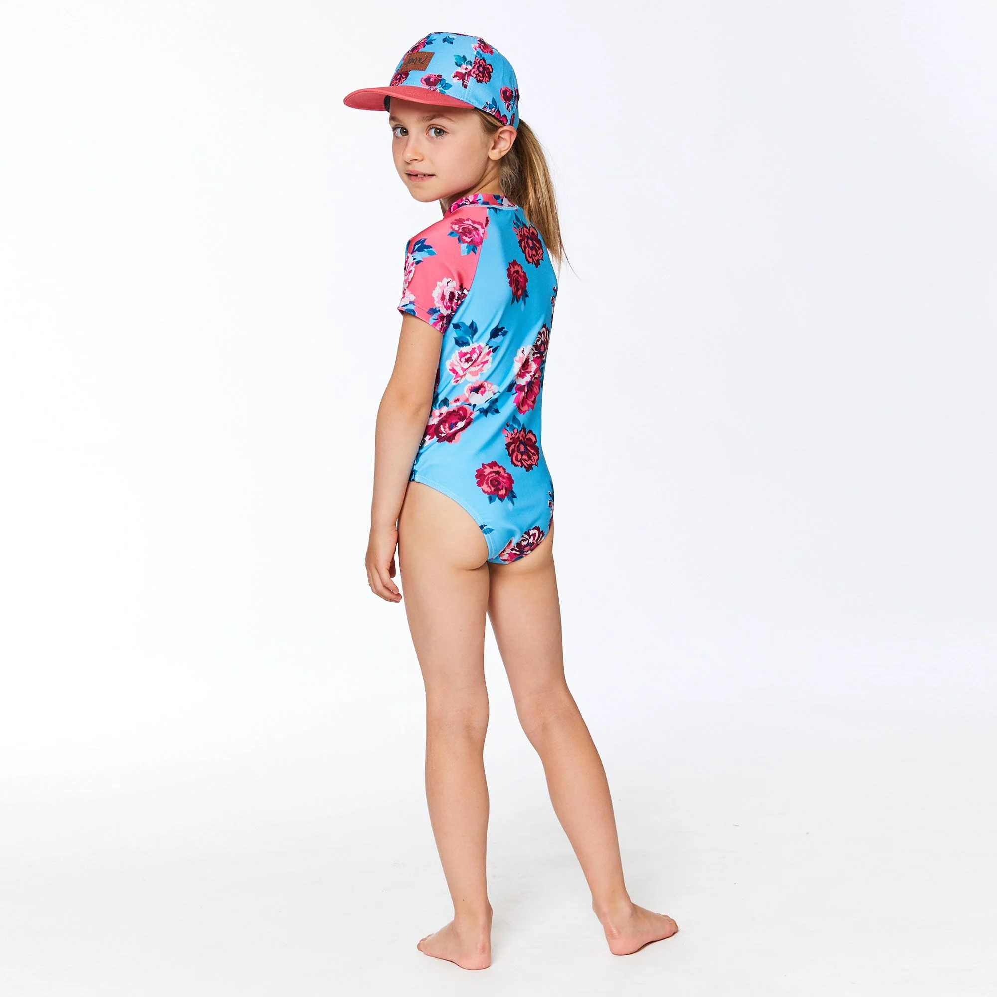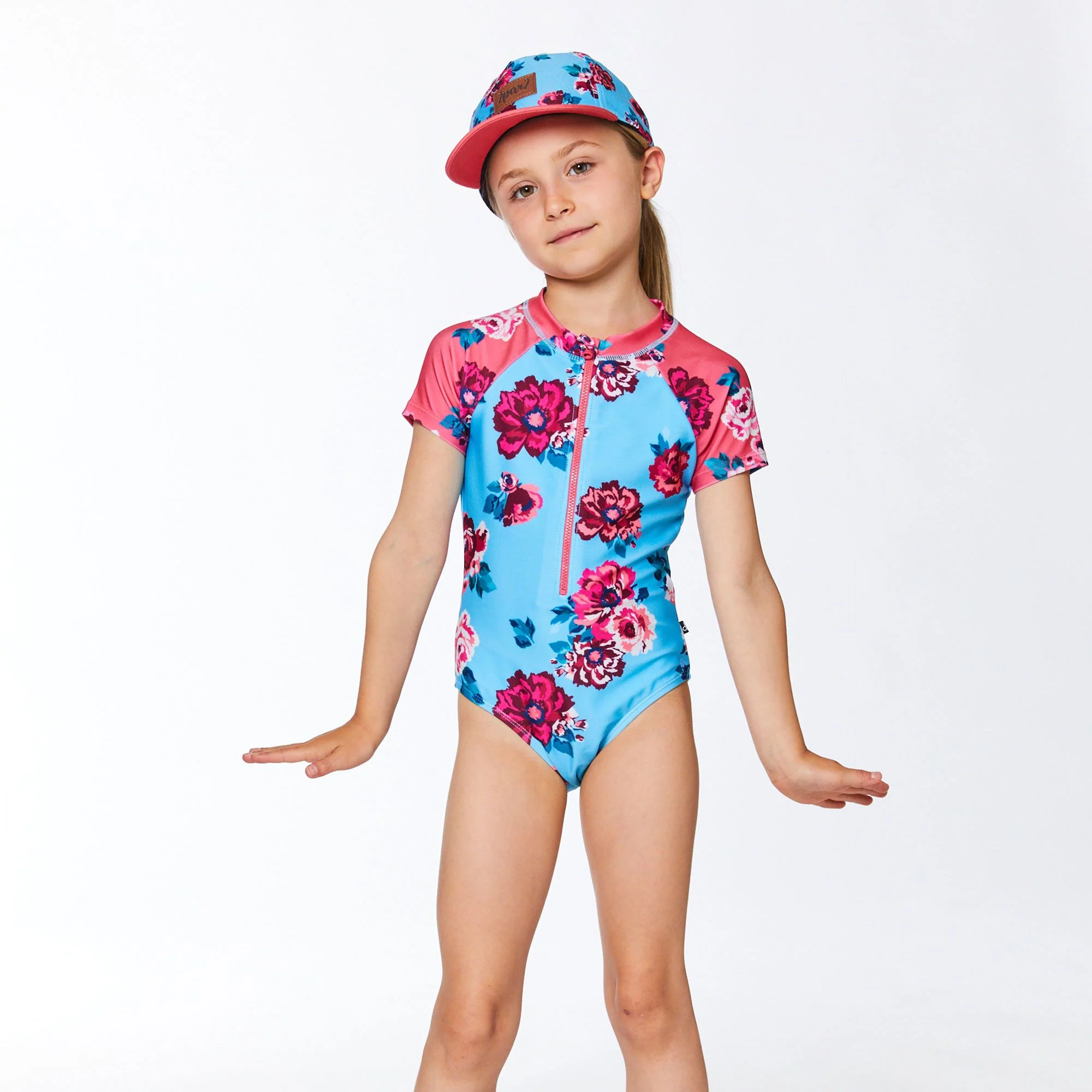Maillot Rashguard Deux par Deux une pièce manche courte rose et bleu imprimé de roses E30NG11