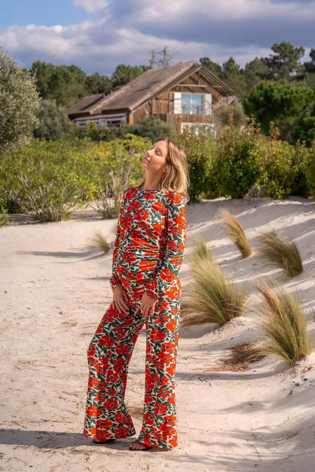 Le top Mona est le haut parfait pour mettre en valeur son ventre de femme enceinte. Avec une coupe ajustée et des manches légèrement évasées, il se porte en toutes circonstances. Il se marie parfaitement avec le pantalon Andrea du même imprimé pour un effet total look seventies. Il se porte également très facilement avec votre jean de grossesse ou votre legging de grossesse.