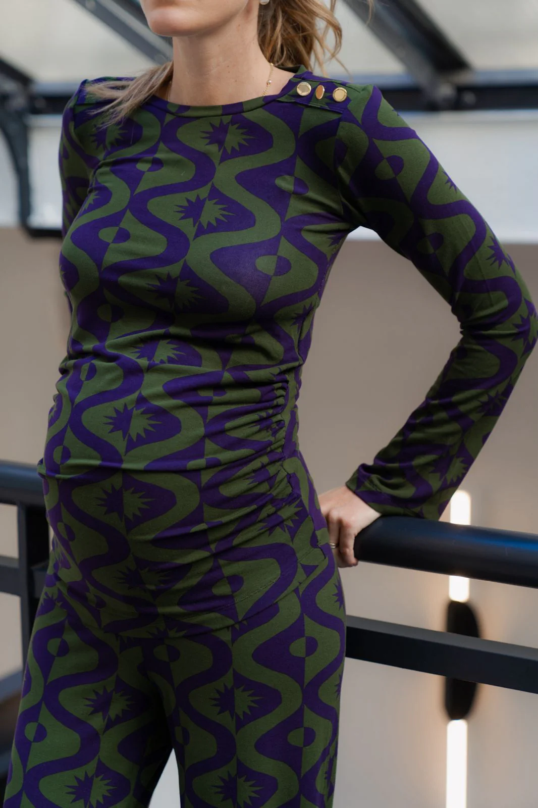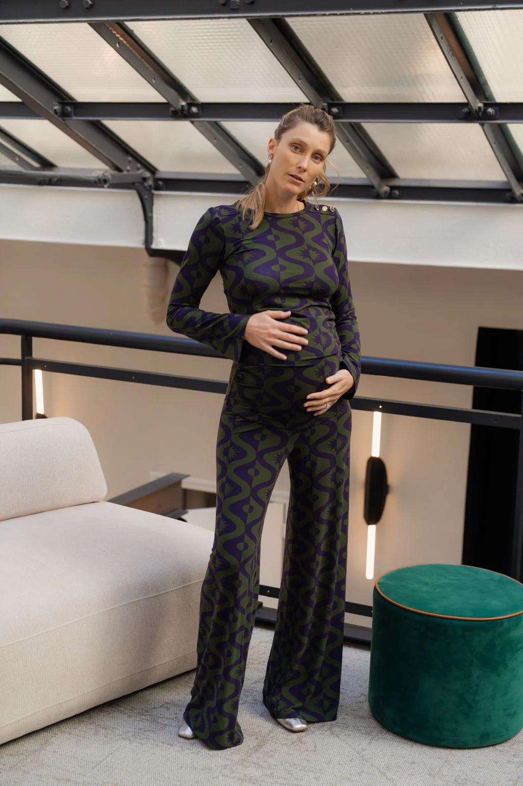 Le top Mona est le haut parfait pour mettre en valeur son ventre de femme enceinte. Avec une coupe ajustée et des manches légèrement évasées, il se porte en toutes circonstances. Il se marie parfaitement avec le pantalon Andrea du même imprimé pour un effet total look seventies. Il se porte également très facilement avec votre jean de grossesse ou votre legging de grossesse.