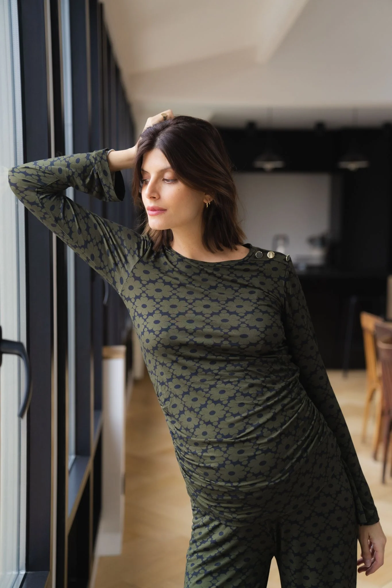 Le top Mona est le haut parfait pour mettre en valeur son ventre de femme enceinte. Avec une coupe ajustée et des manches légèrement évasées, il se porte en toutes circonstances. Il se marie parfaitement avec le pantalon Andrea du même imprimé pour un effet total look seventies. Il se porte également très facilement avec votre jean de grossesse ou votre legging de grossesse.