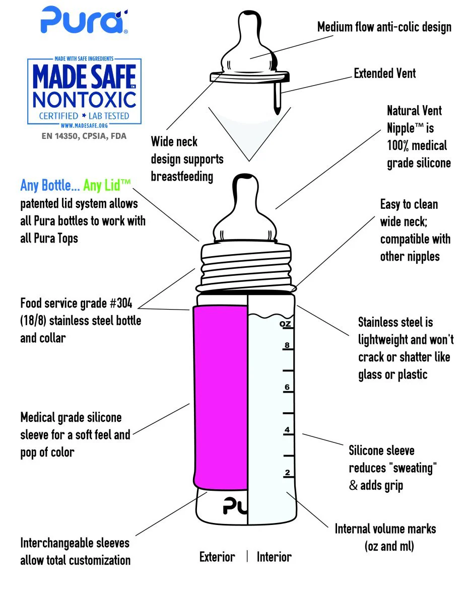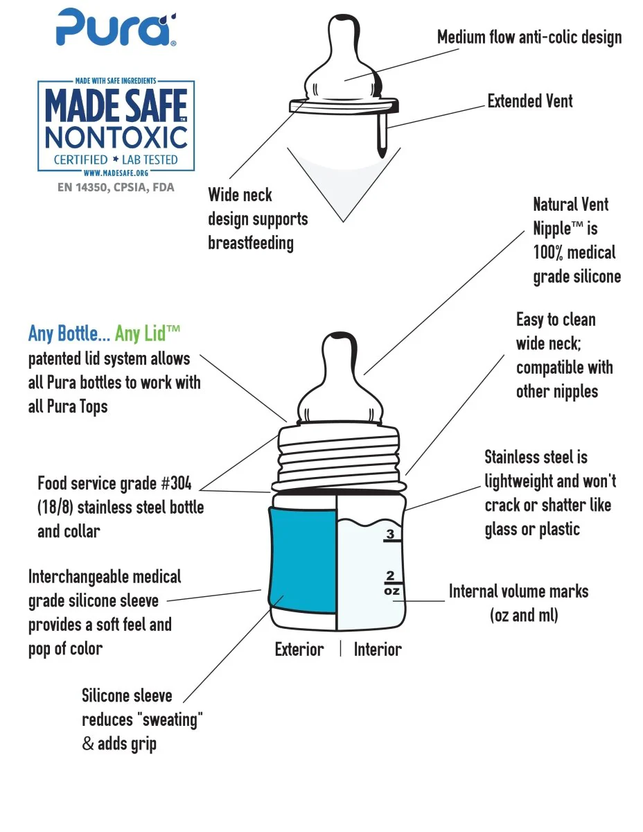 - Ces biberons sont conçu pour grandir avec votre enfant, ils se transforment facilement en changeant simplement la tétine pour un bec à gorgée ou remplacent la tétine par un autre couvercle Pura