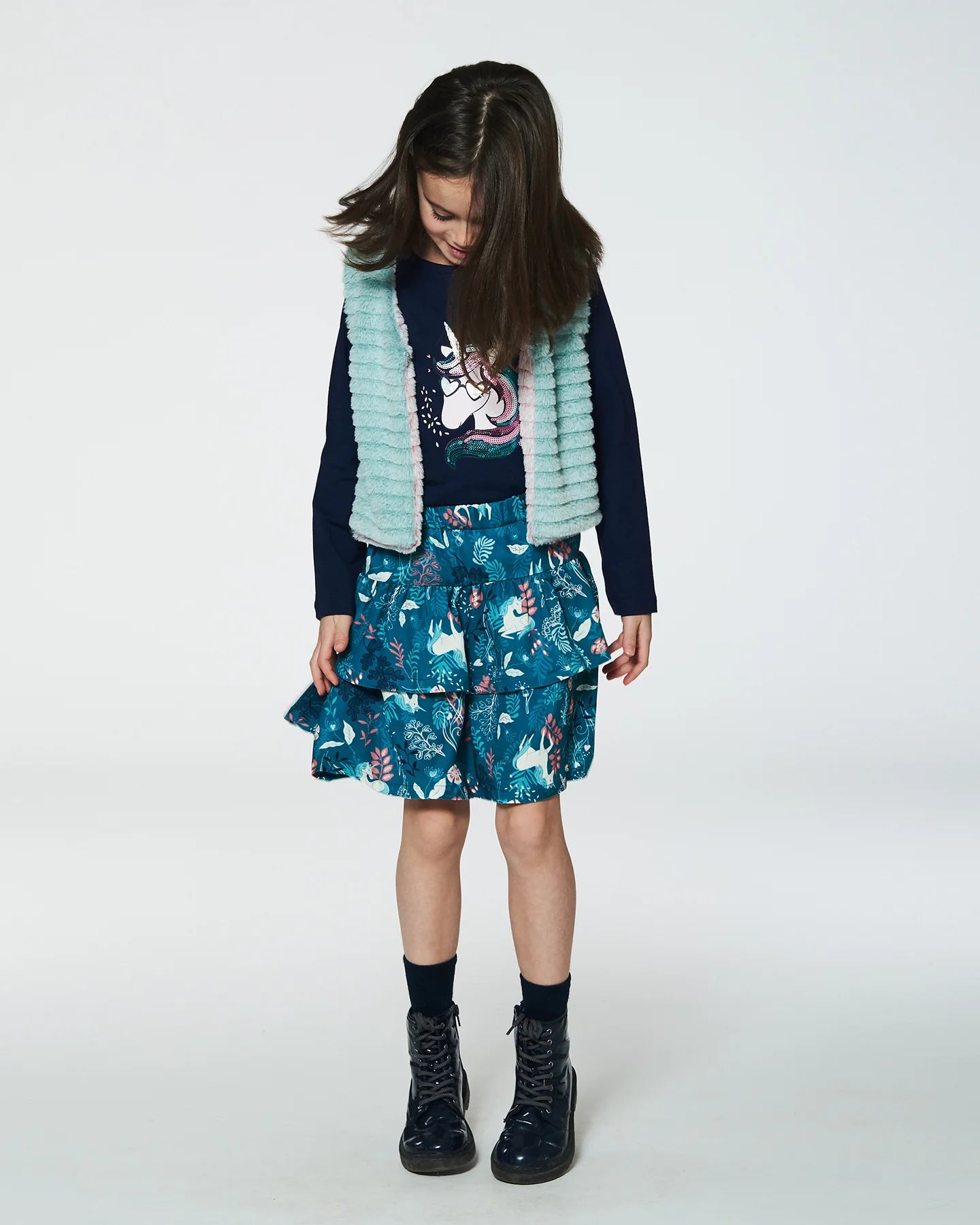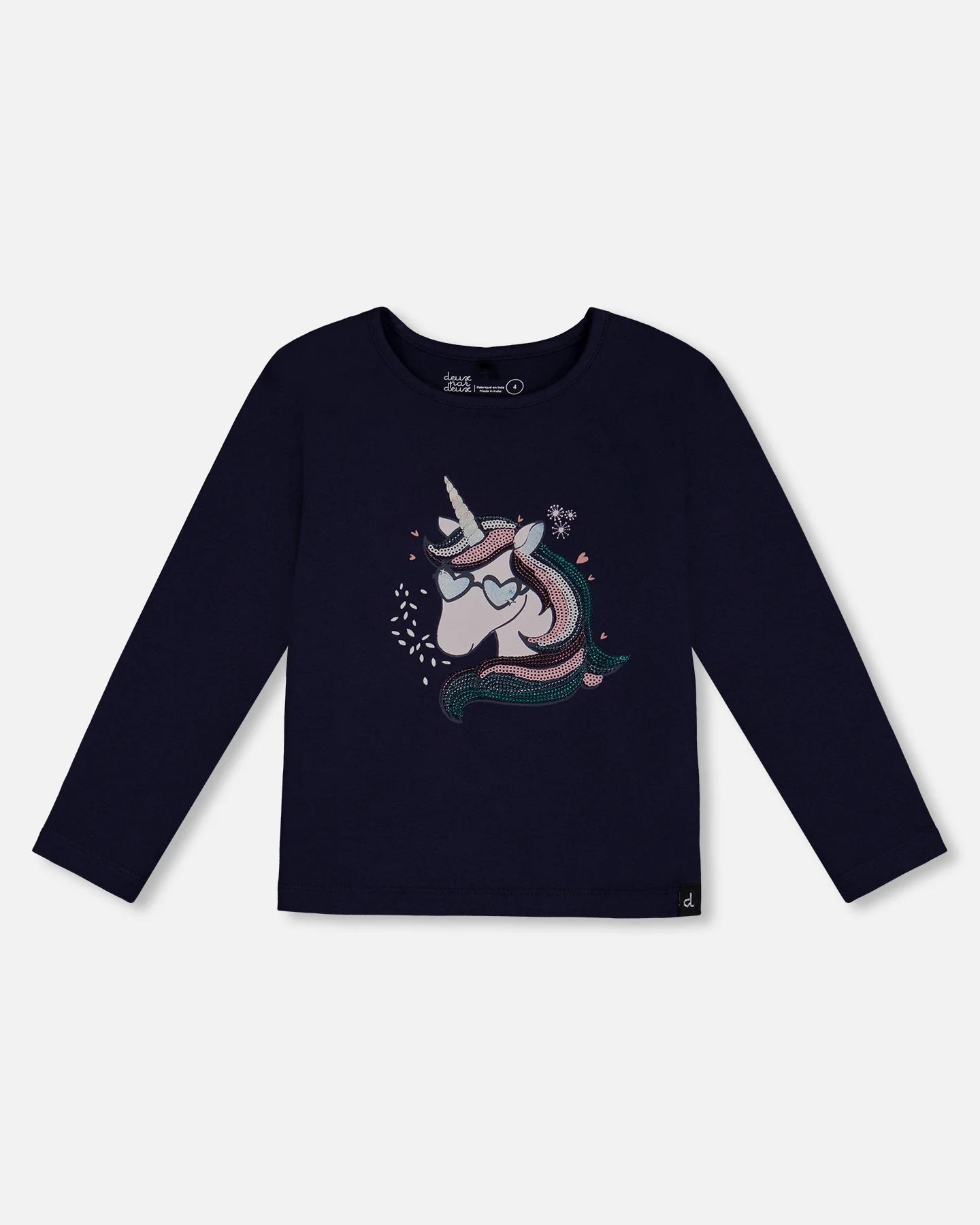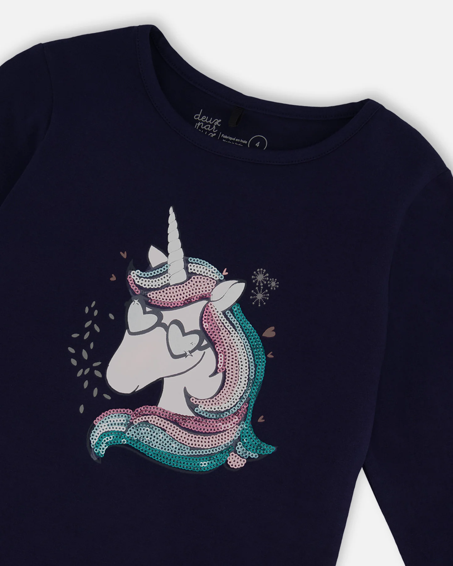T-shirt marine avec un imprimé licorne de Deux par Deux parfait pour agencer avec la jupe Ma licorne d’argent