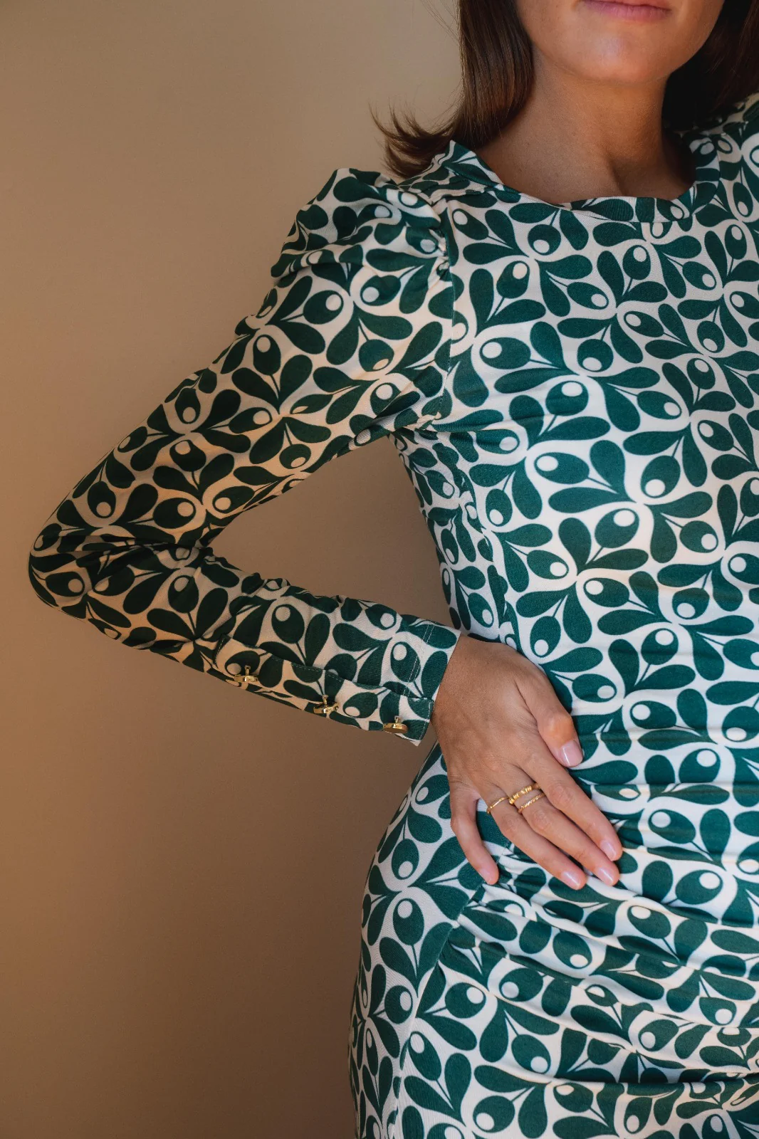 – Manches longues ajustées avec 3 boutons dorés, volume froncé à l’épaule.