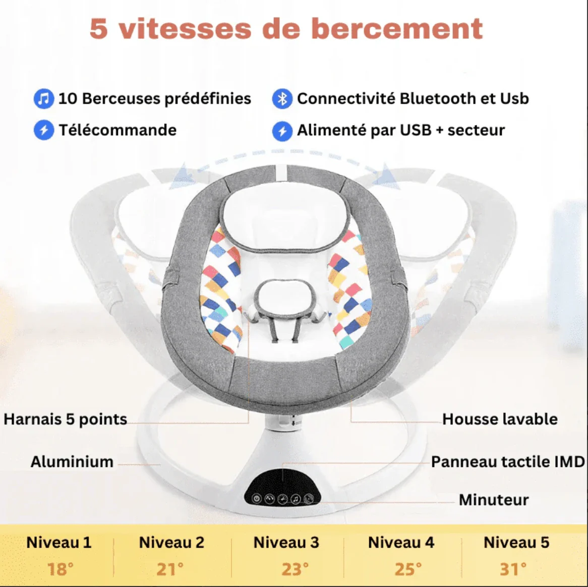 ✔ Balancement automatique réglable pour un bercement naturel et apaisant.